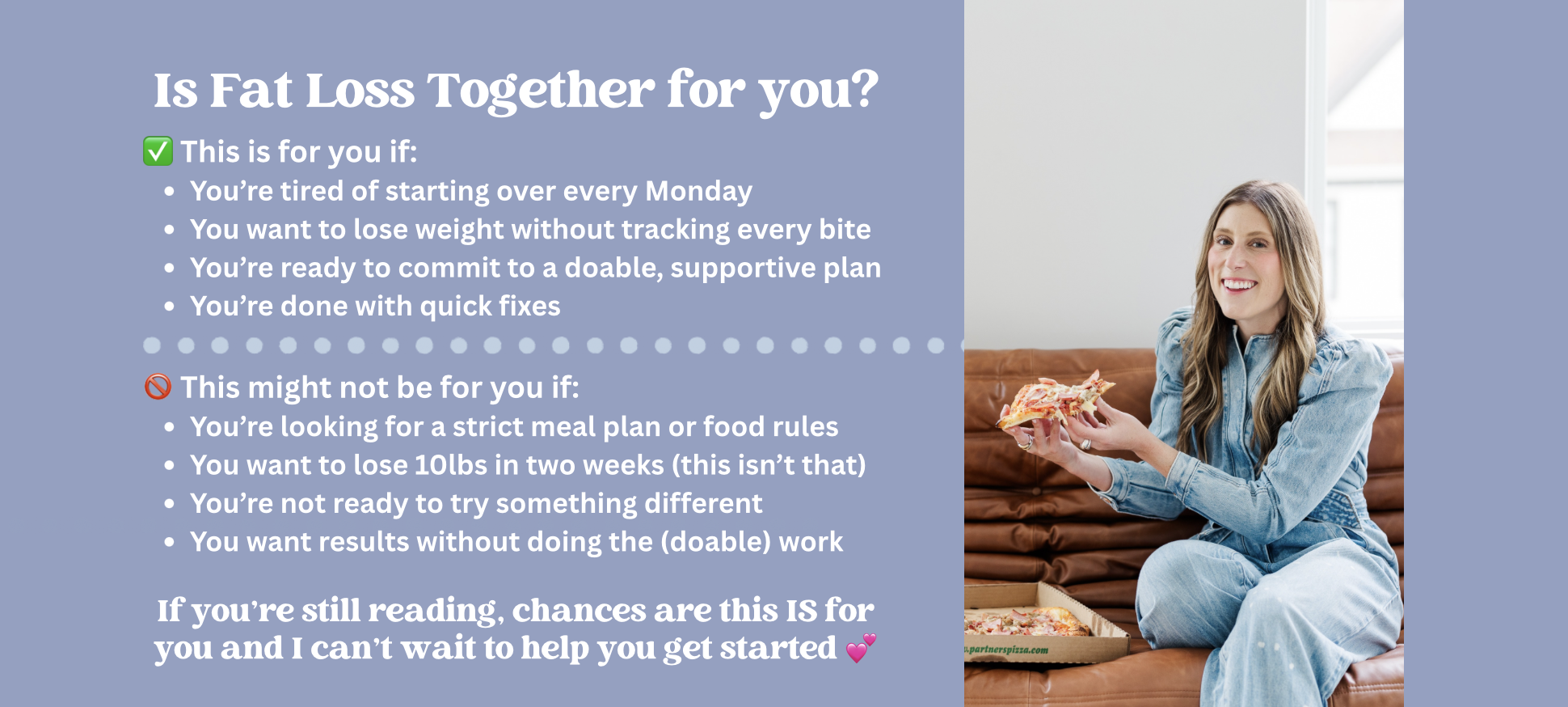 Fat Loss Together is for the woman who is ready to lose weight without tracking 24/7, skipping pizza night or cooking a separate dinner from the rest of the family.